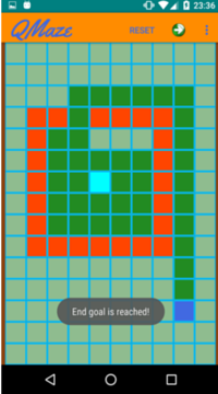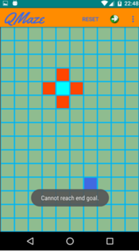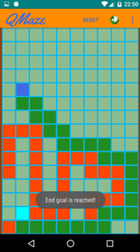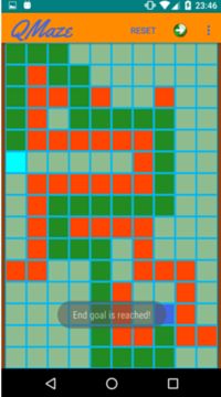QMaze   This application is a game maze which finds a shortest path between start point and end point by avoiding obstacle squares. The start and end point in the maze are placed by the user by simply touching one of the squares. User can reset start and end location of square points. After setting start and end square points, user can then place obstacles - red squares. The purpose of this maze is to reach the end point by avoiding all red square obstacles. In case the dead end is reached, the best traced path so far gets backtracked until another path is found, or no path exists.   All the buttons in this app are created dynamically. That is, no xml code is present in the layout content xml files for any of the buttons at compile time. This project features a seaparte Thread with Runnable which uses Handler to update main UI thread, so that our UI thread is not overloaded. Because of this and the onSavedInstance state method, this app also supports screen orientation with no content beeing lost.